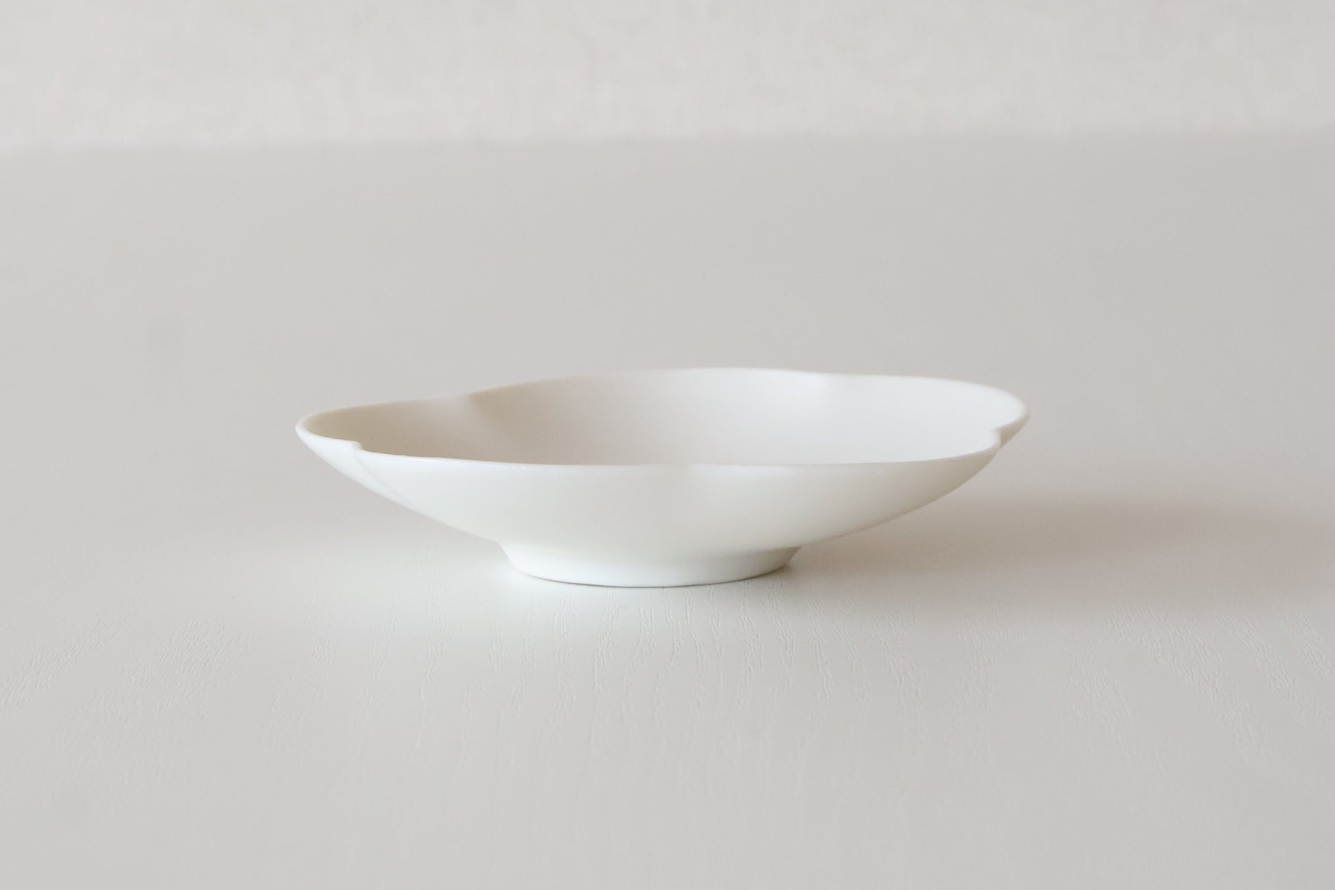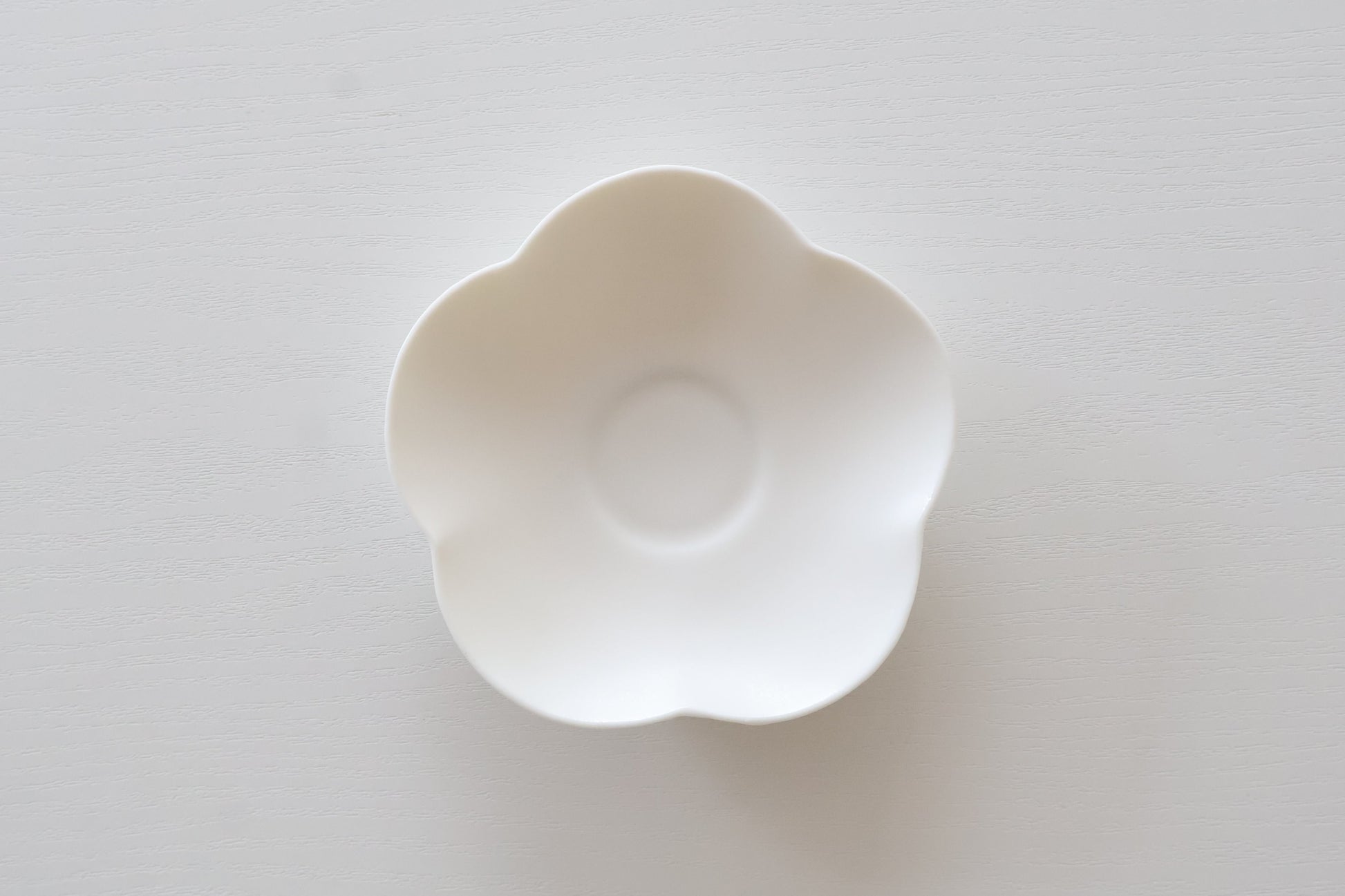 小さな梅の花を思わせる、やわらかなかたちの梅皿です。清らかな白磁が食卓にやさしい彩りを添え、日々のひとときをほんの少し特別にしてくれます。贈り物としても、ご自分の食卓を整える器としても、心地よい存在感を放ちます。