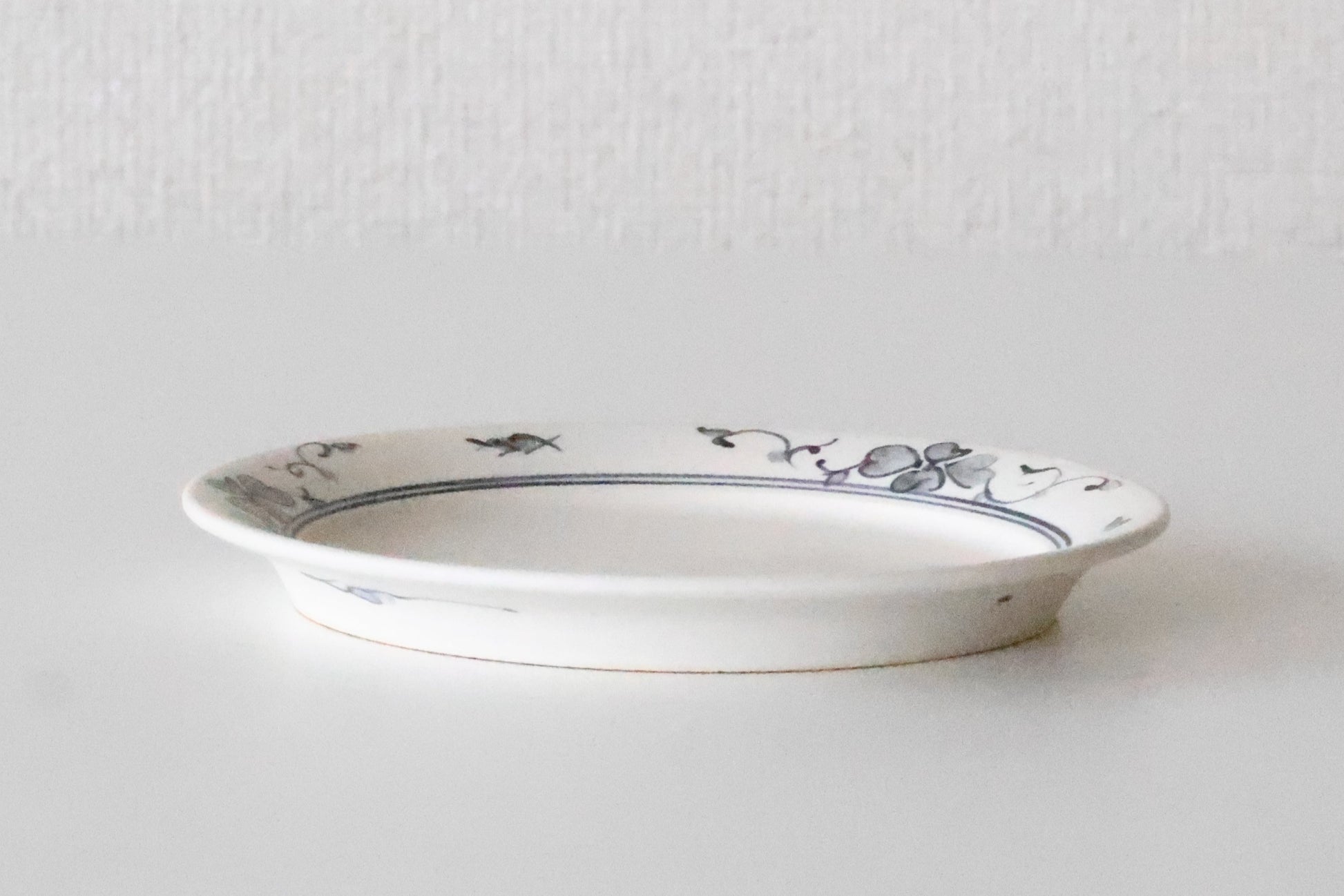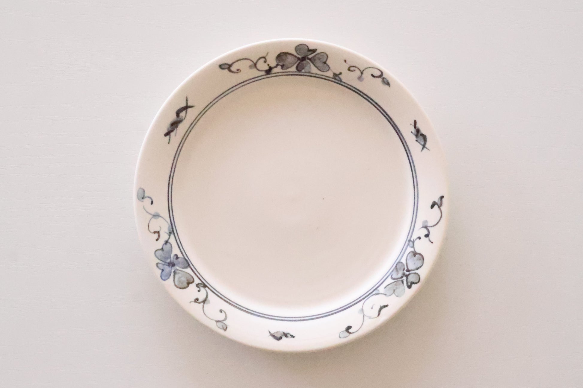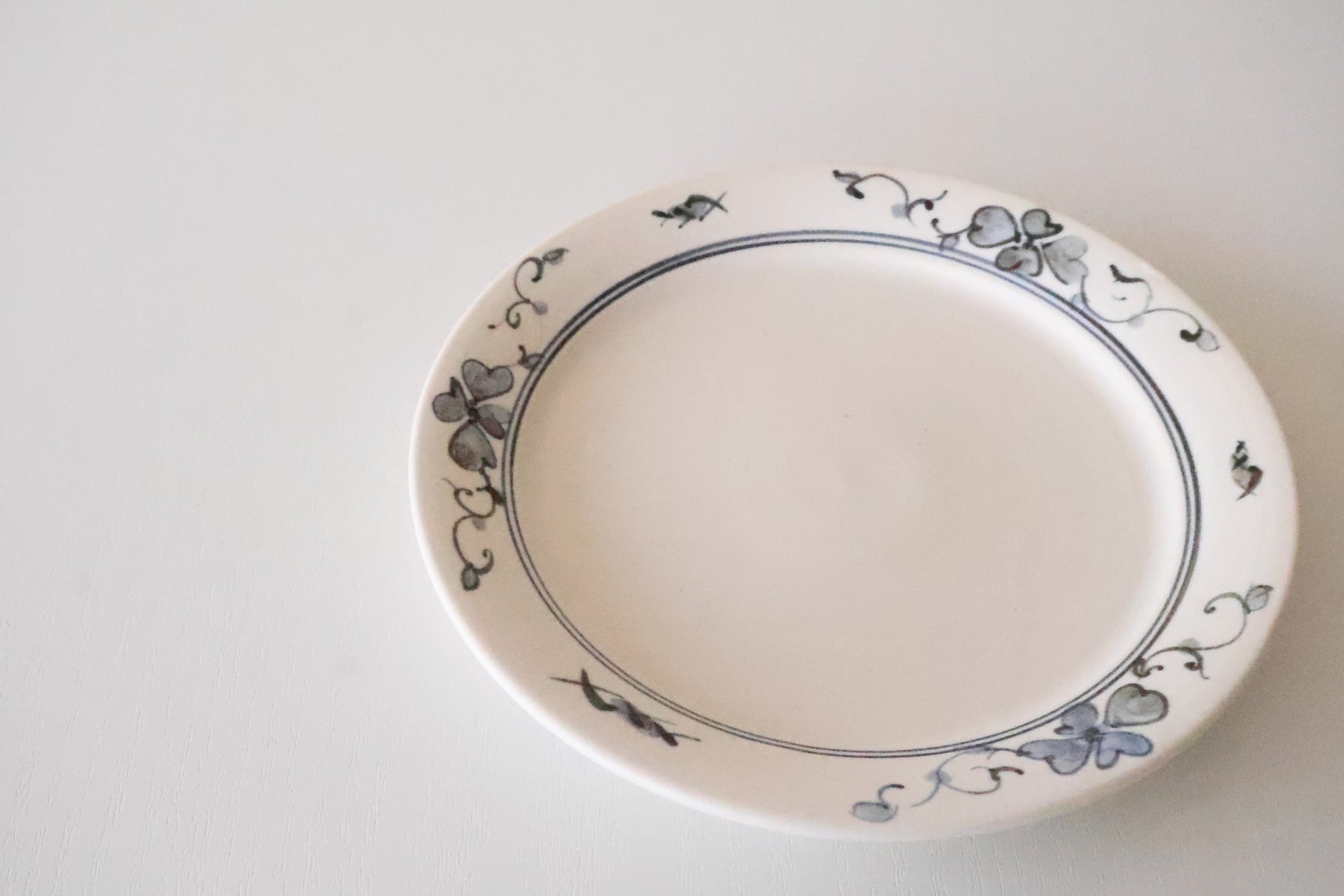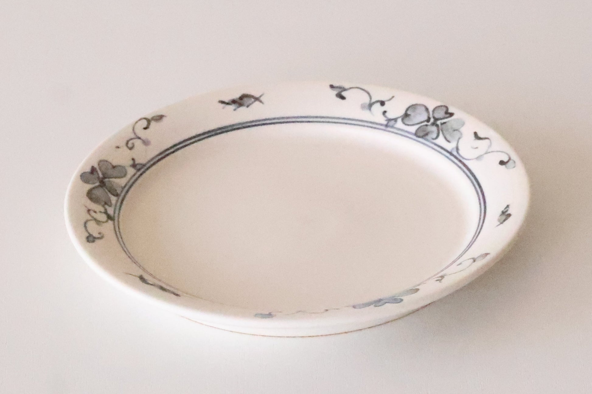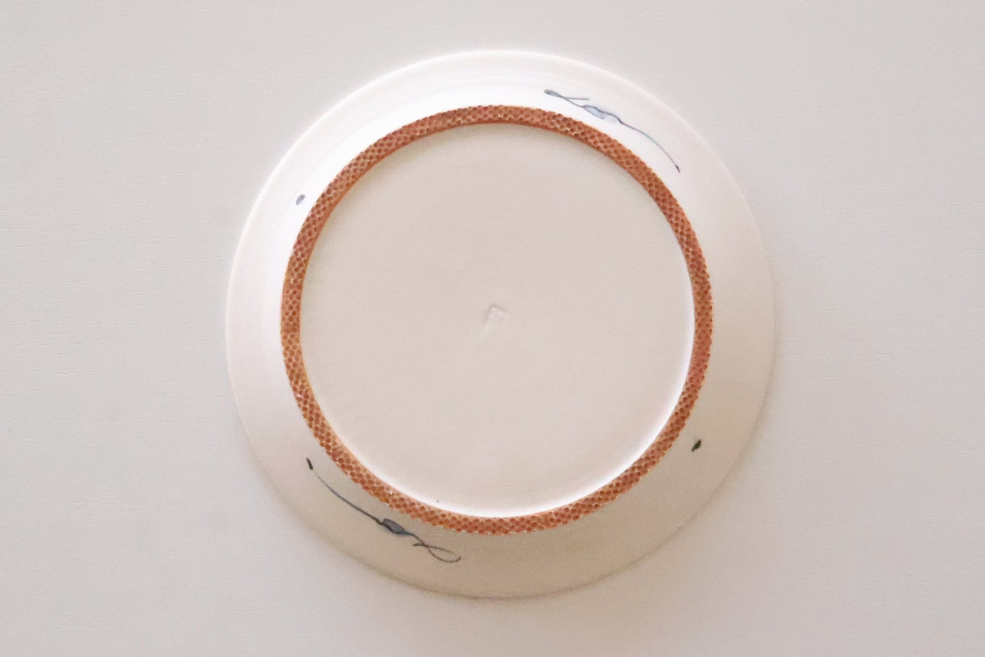 ほどよいサイズ感で、和洋問わずさまざまなお料理に合います。前菜やデザートの盛り付け、小さめのワンプレートとしてもお使いいただけます。縁の模様がやわらかい印象を添え、食卓をやさしく彩ります。