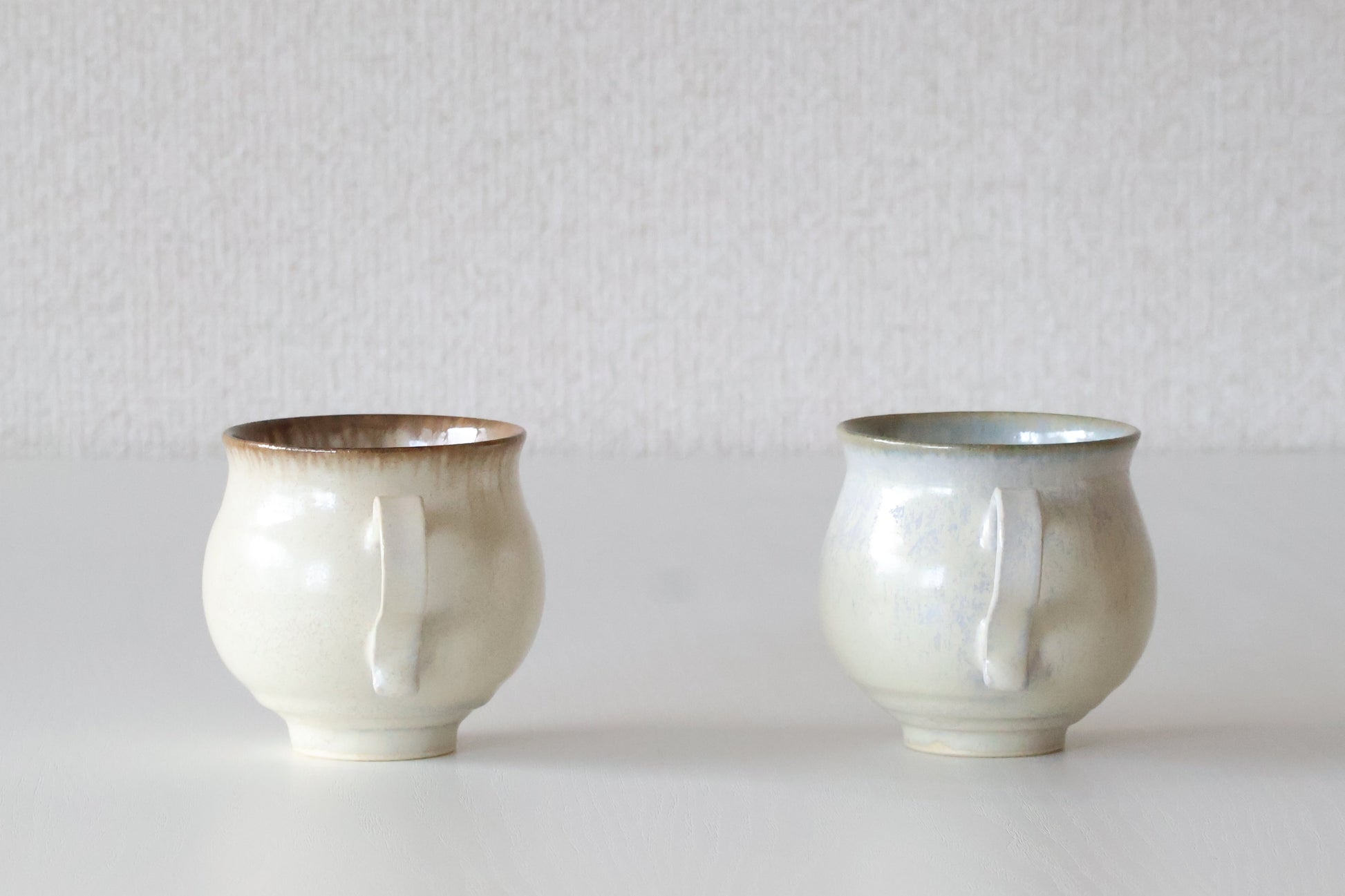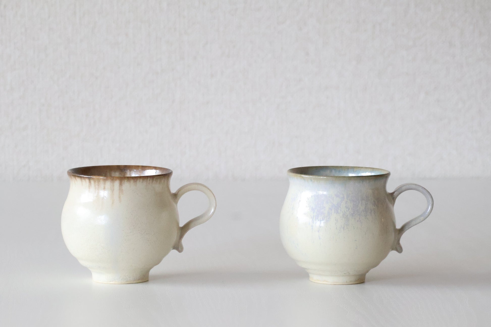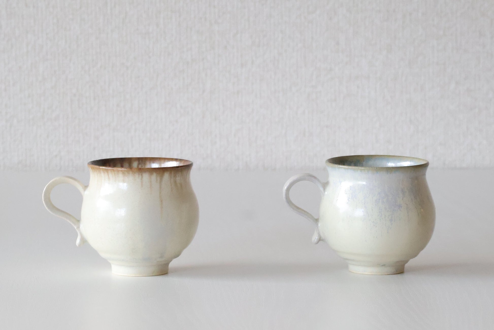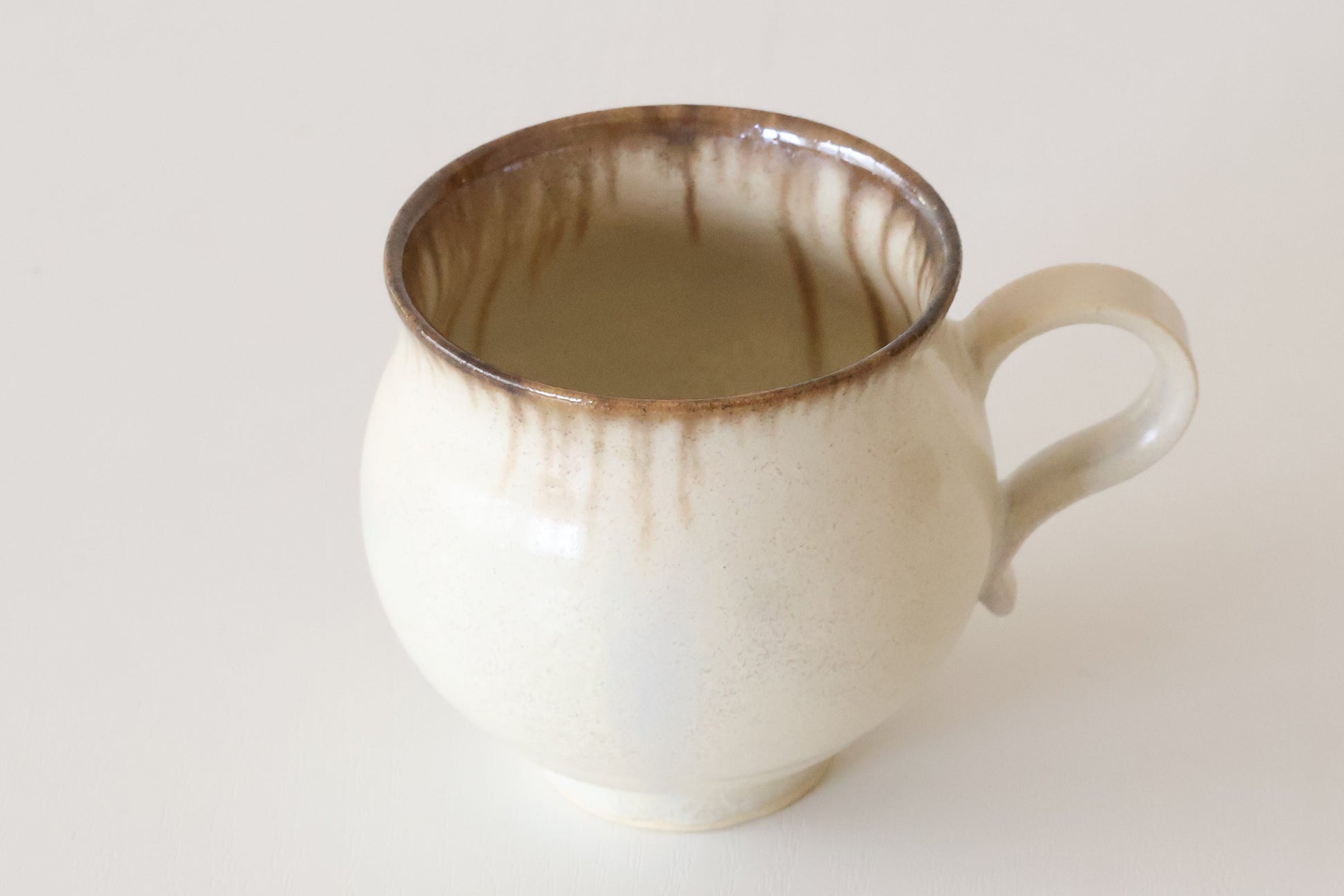 くるりとねじった取手が目を引く、愛らしいマグカップ。指に優しくなじむ形は、見た目のアクセントだけではなく、持ちやすさも兼ねそなえています。淡くやわらかな白地に、釉薬の濃淡が生む美しい景色。使うたびに手になじみ、ほっとする時間と温もりを届けてくれる、松尾さんらしい逸品です。