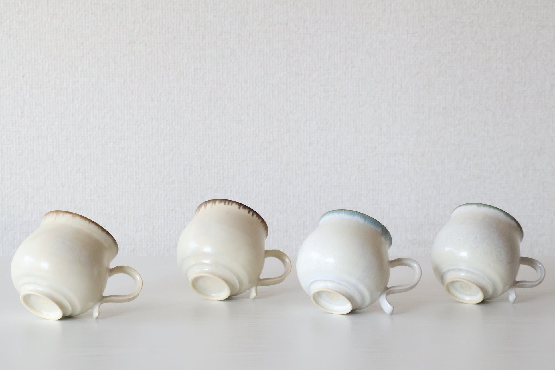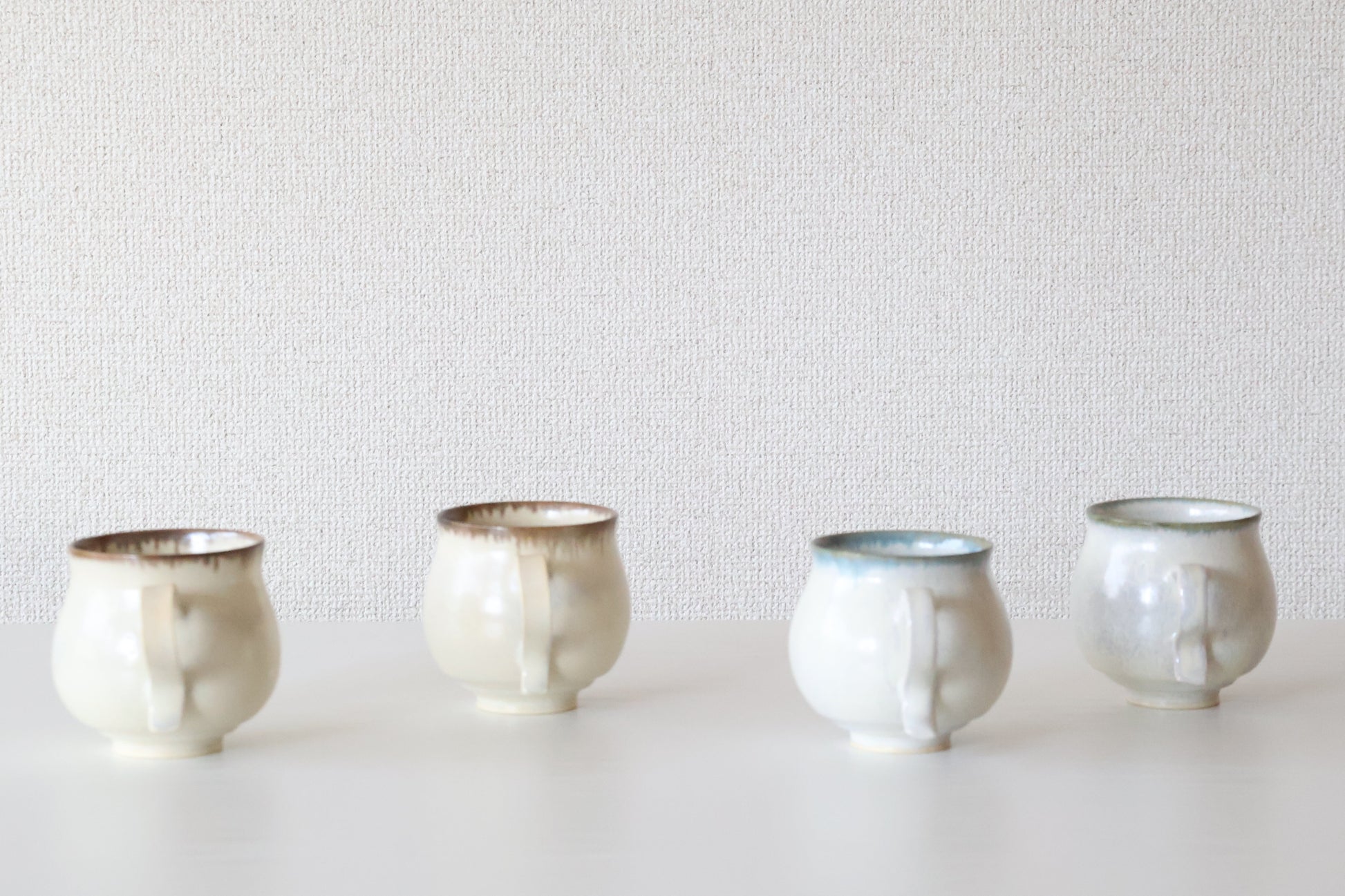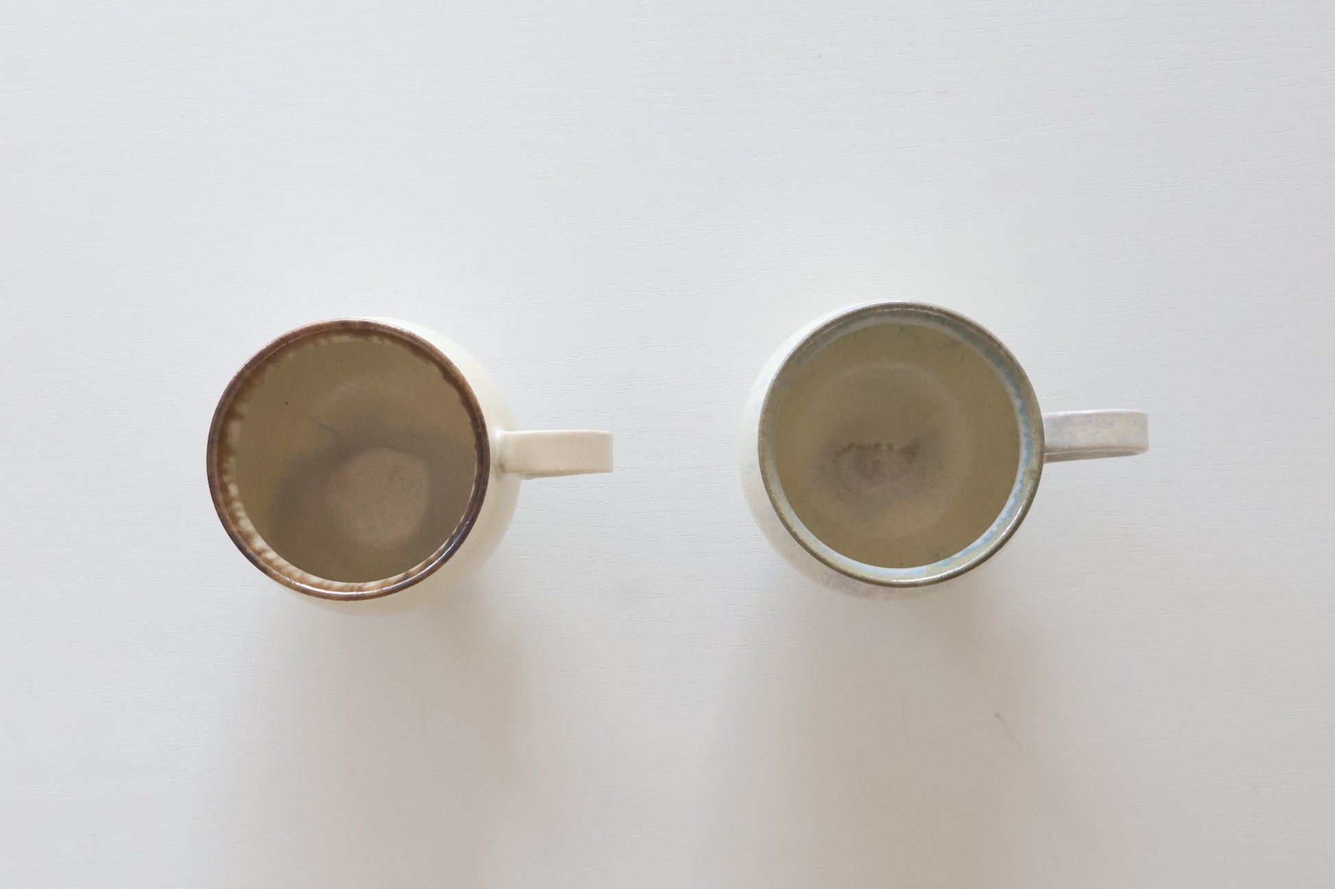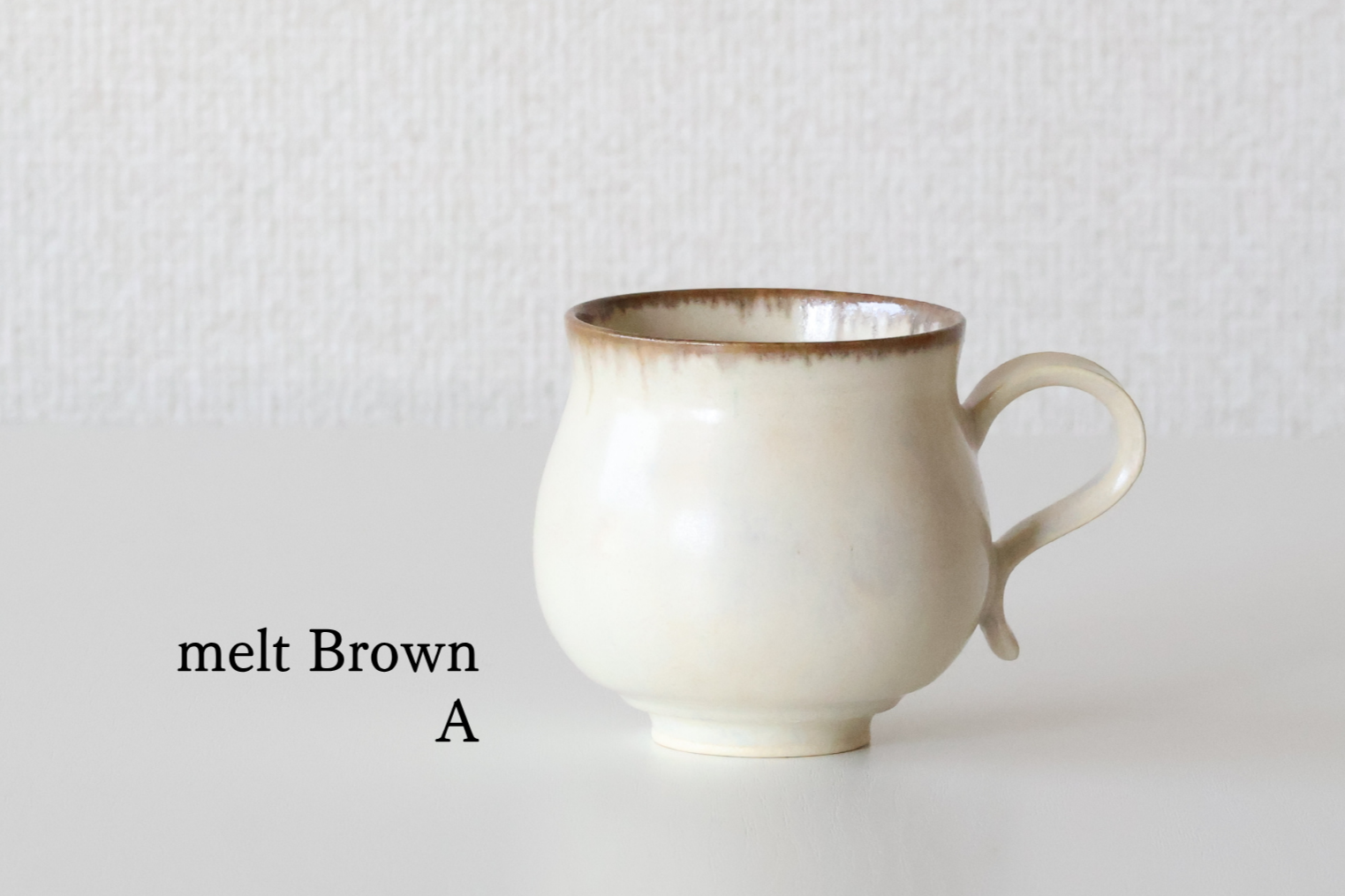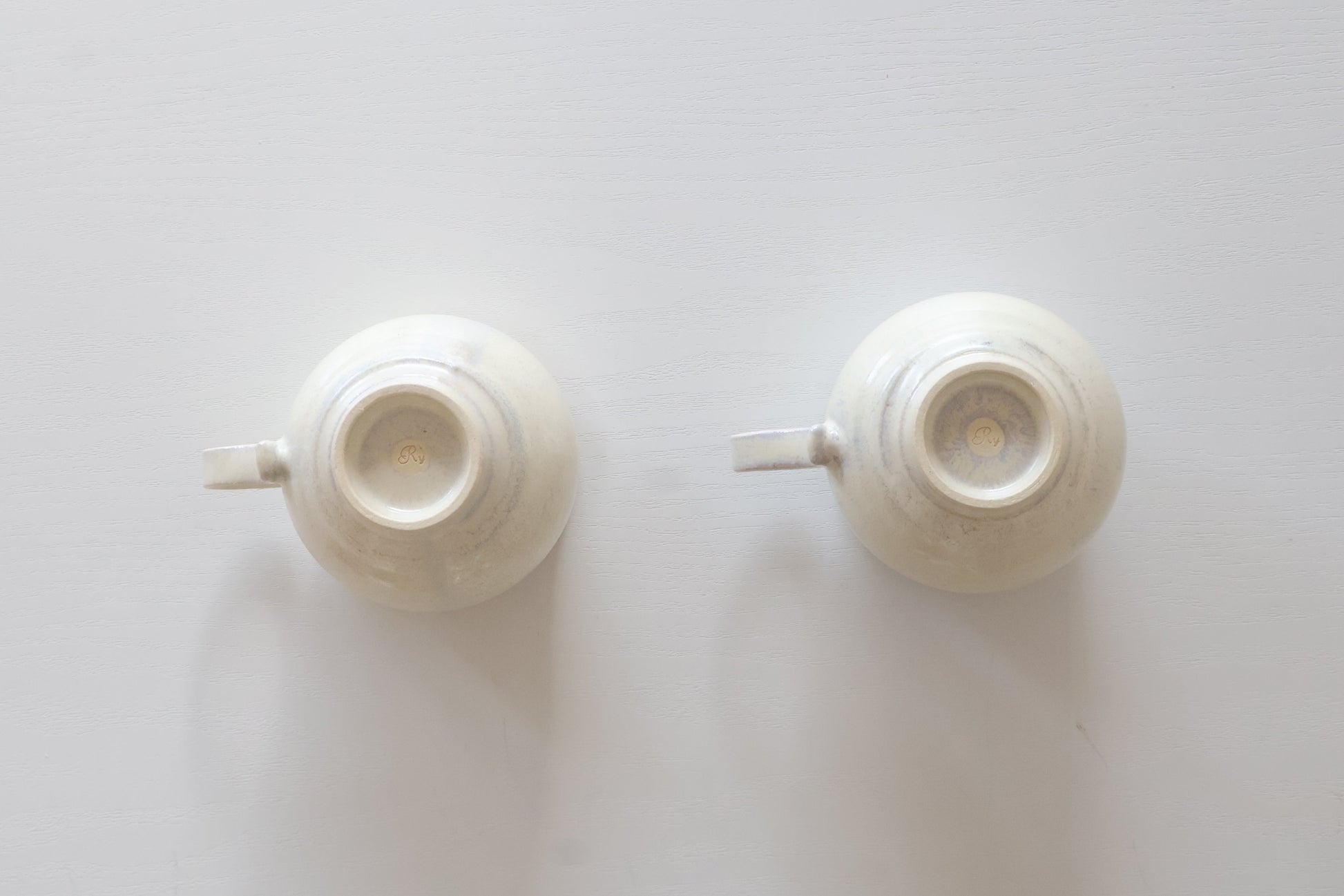 くるりとねじった取手が目を引く、愛らしいマグカップ。指に優しくなじむ形は、見た目のアクセントだけではなく、持ちやすさも兼ねそなえています。淡くやわらかな白地に、釉薬の濃淡が生む美しい景色。使うたびに手になじみ、ほっとする時間と温もりを届けてくれる、松尾さんらしい逸品です。