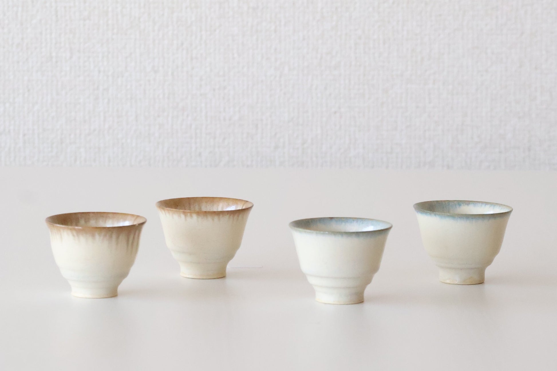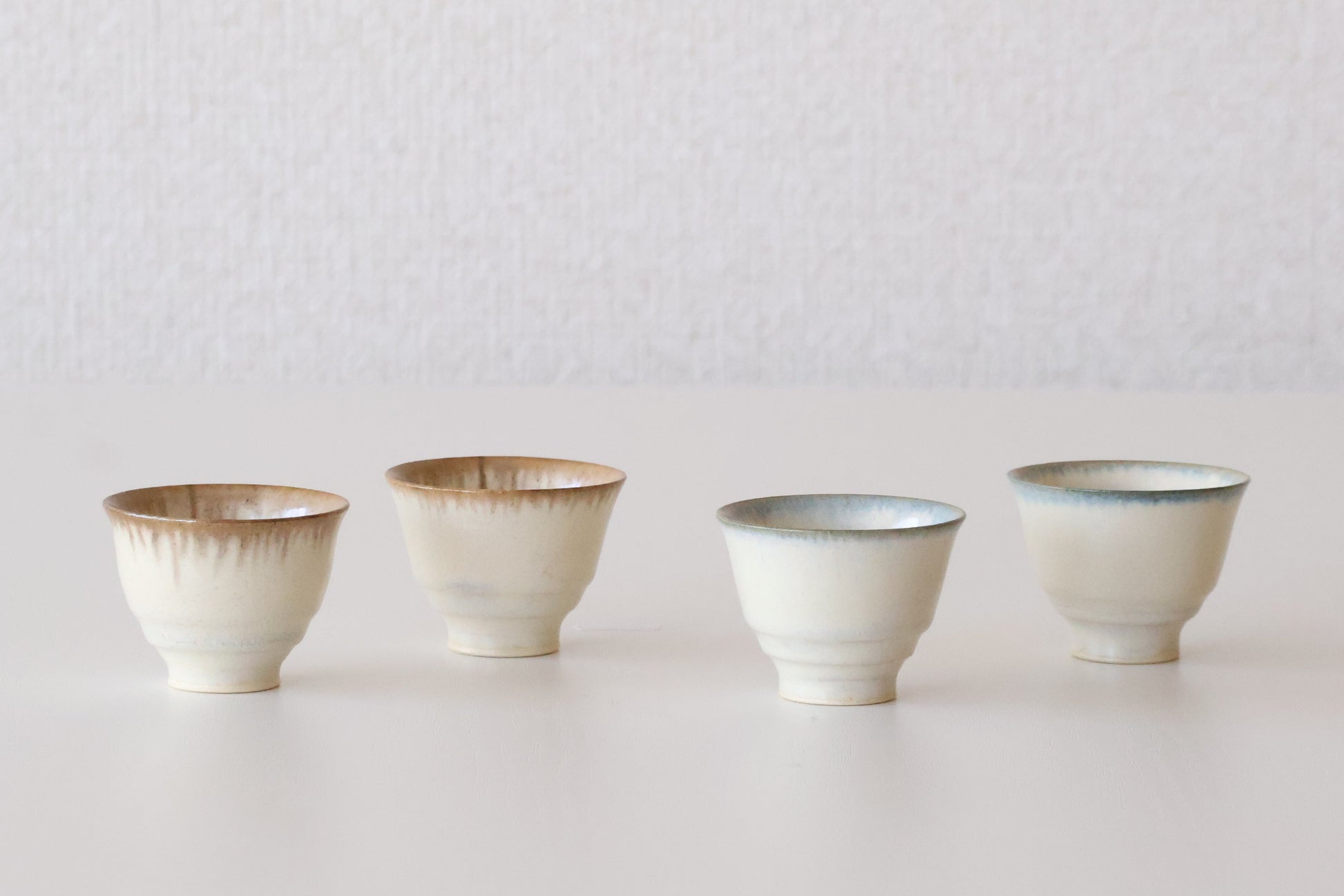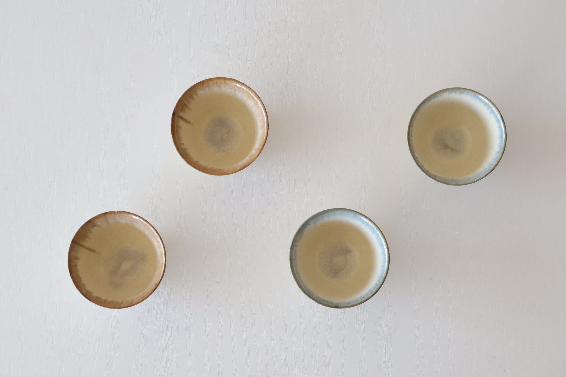 淡くにじむ釉薬の表情が美しい、小ぶりなお猪口。手にすっと収まる形と口当たりのやさしさが魅力です。一つ一つ異なる釉薬の流れが、まるで景色のような趣を生み出し、眺める楽しさも感じられます。