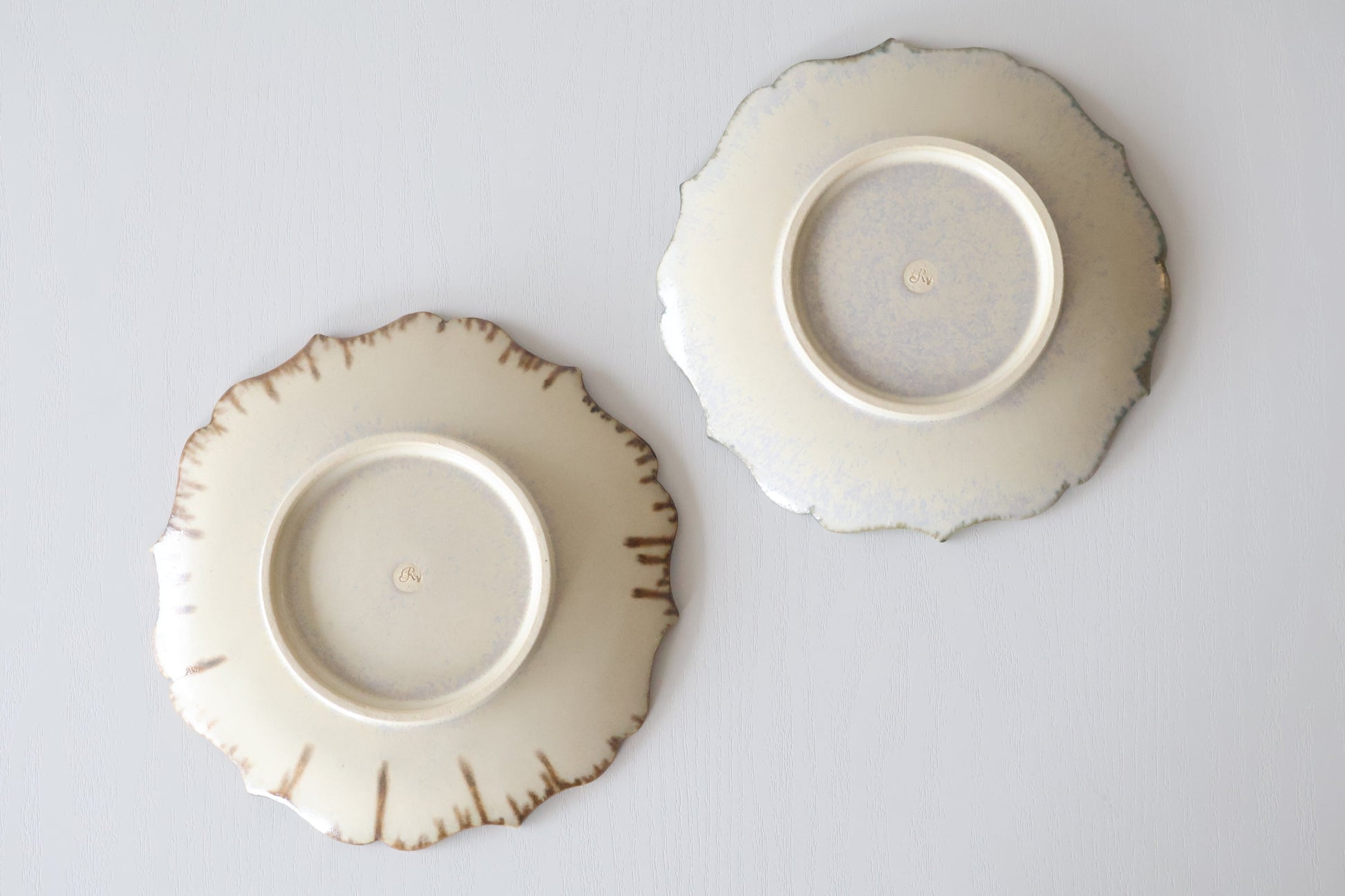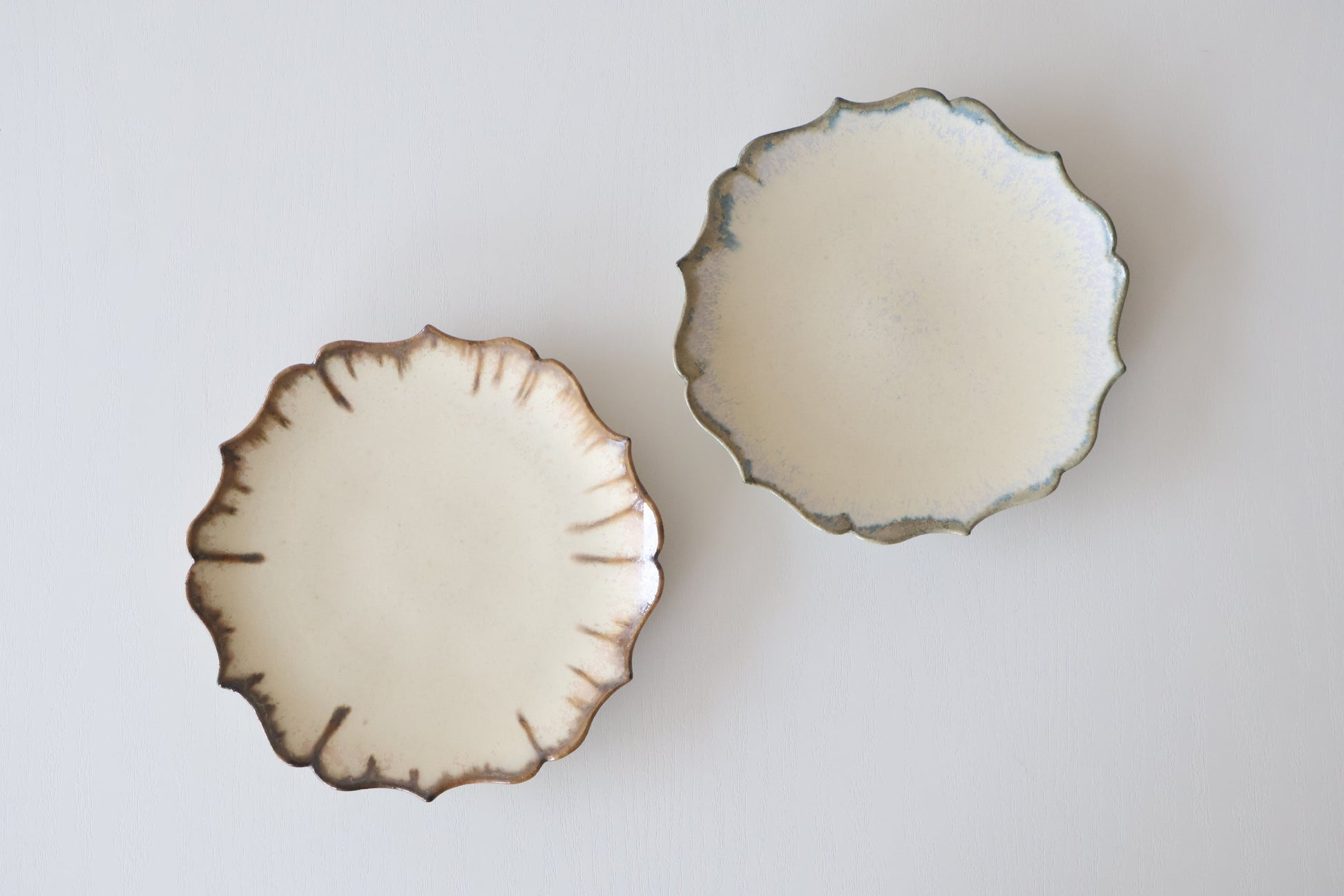 花びらのようにやさしく広がるかたちと、縁にほどこされたほんのりとした釉薬のグラデーション。「稜花皿(りょうかざら)」は、あたたかみと気品をあわせもつ一枚です。やわらかな白の中に、自然な濃淡が浮かぶその表情は、まるで花がふわりと咲いたよう。誰かの特別な日に、「おめでとう」や「ありがとう」の想いをそっと添えて贈りたくなる器です。