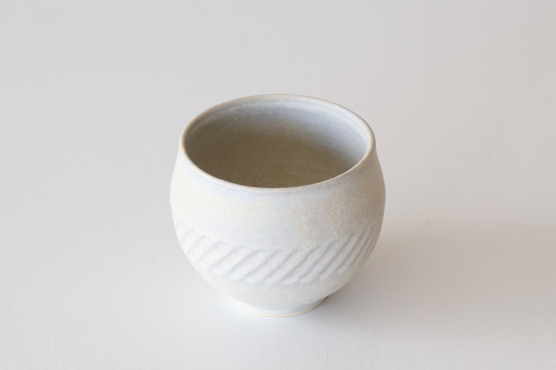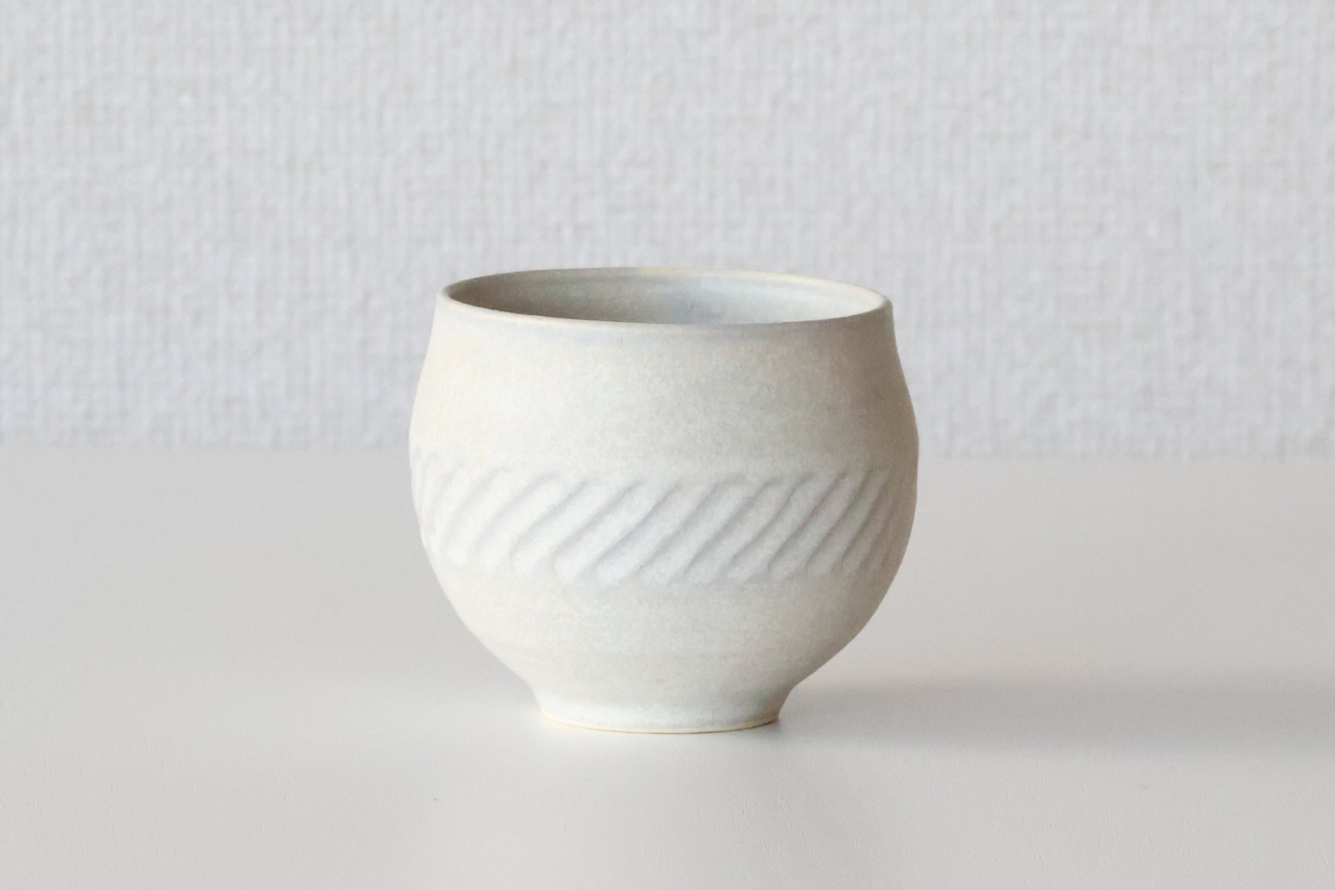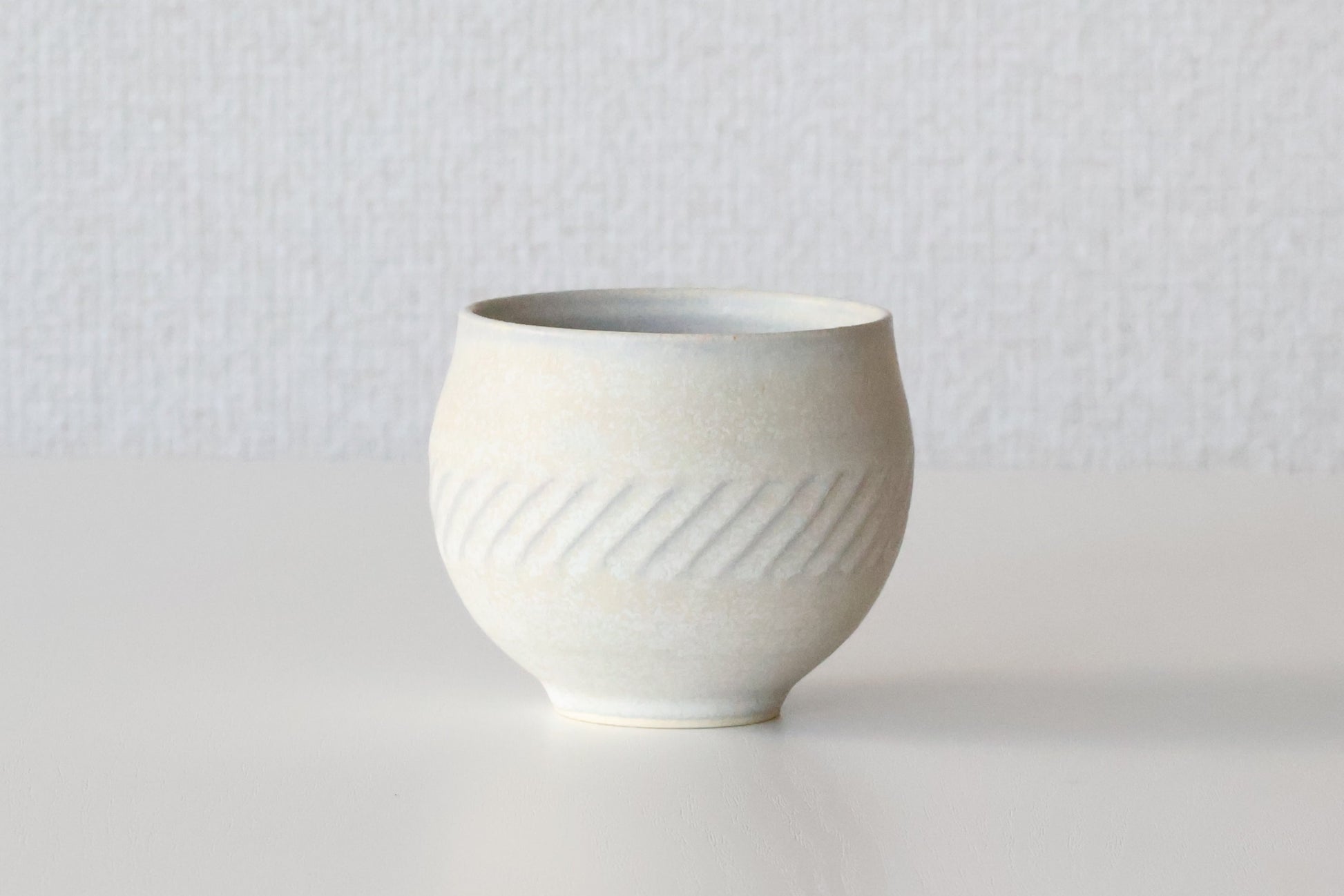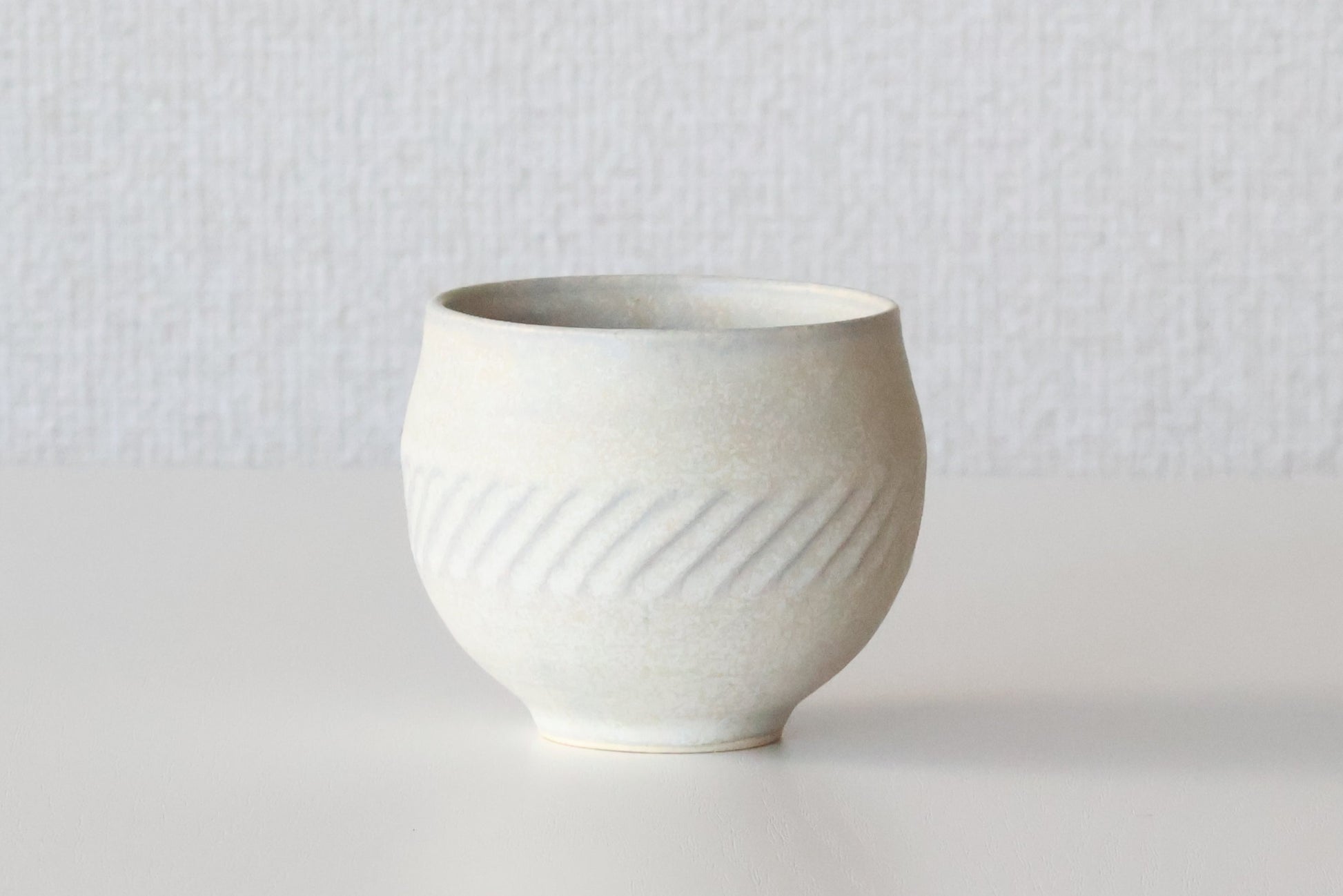 ほんのり丸みを帯びたフォルムが手にやさしく、使うたびにほっとするカップです。あたたかいお茶やコーヒーはもちろん、冷たい飲みものにも使いやすく、季節を問わず活躍してくれます。斜めに施されたしのぎ模様が光を受けて表情を変える様子もお楽しみいただけます。日々の食卓にそっと寄り添い、気持ちまでやわらかくしてくれるような存在です。
