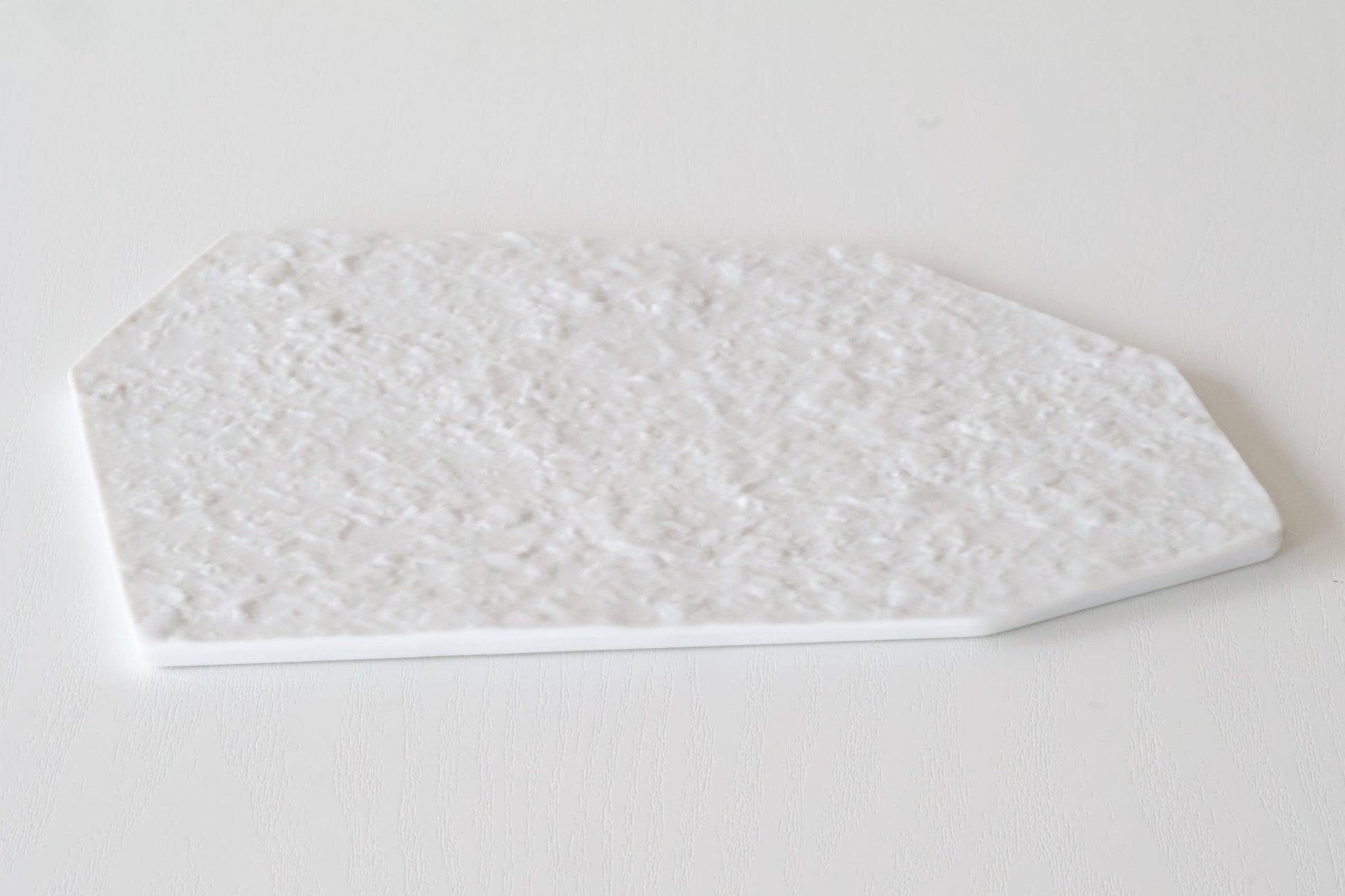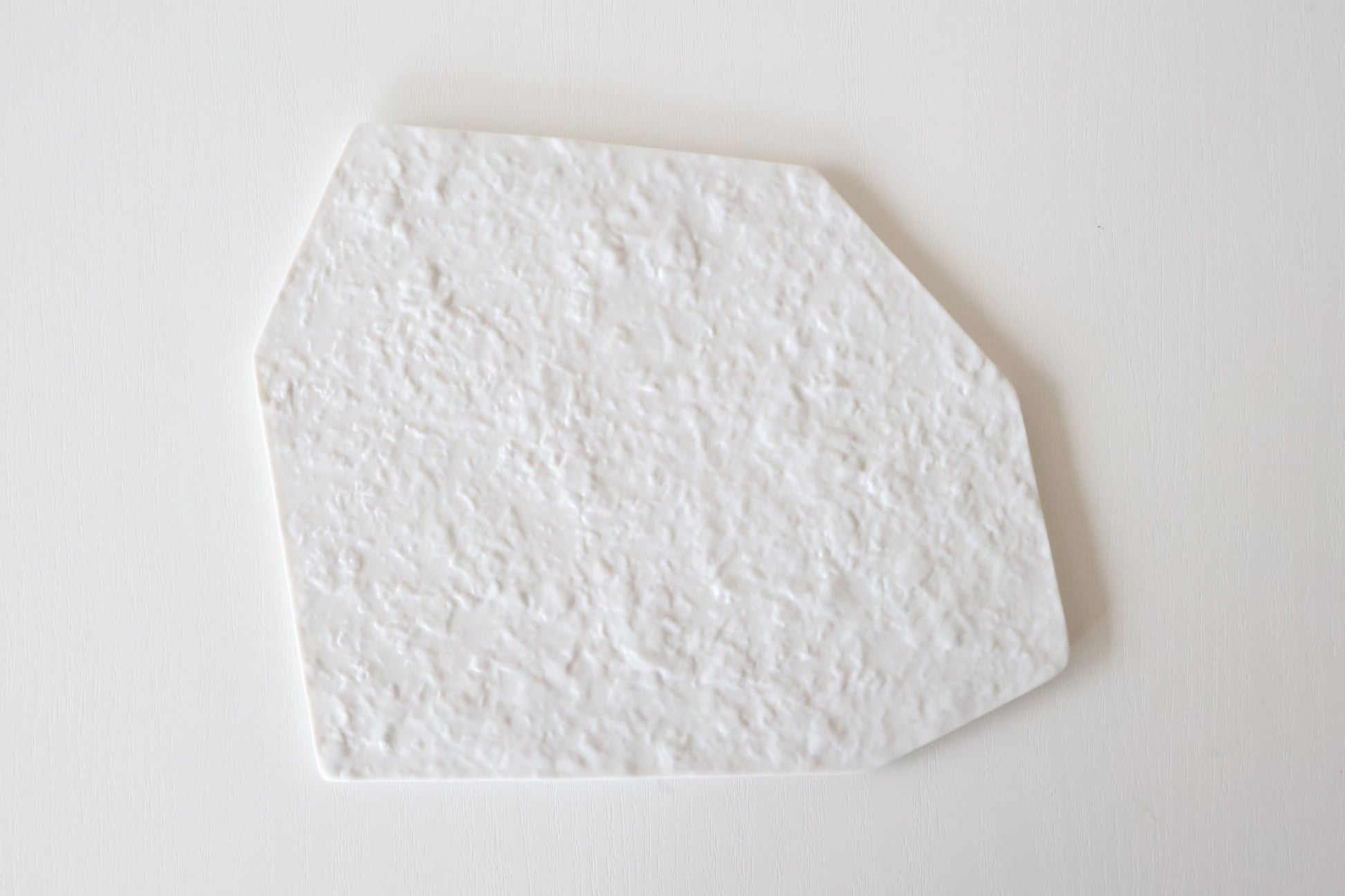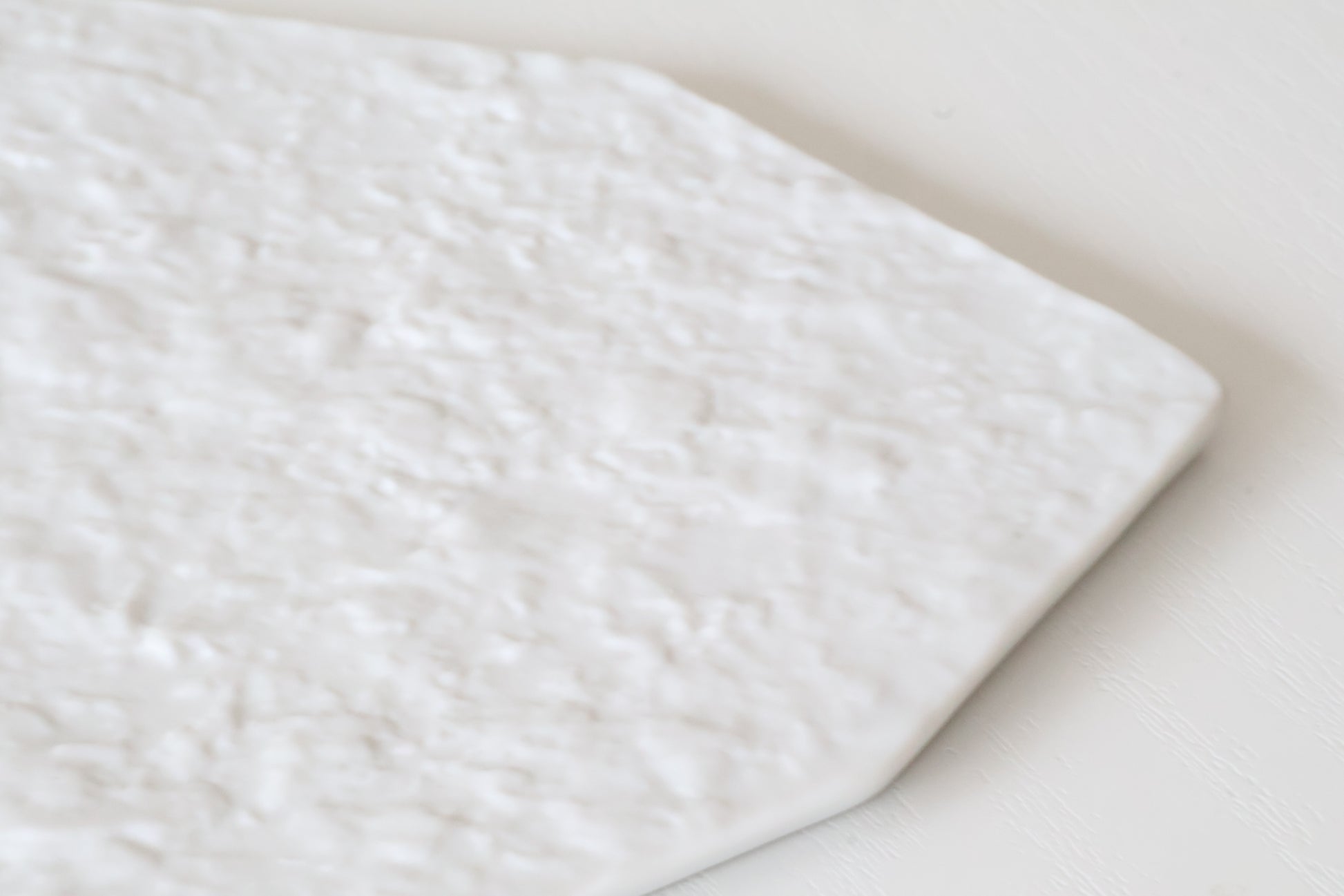 角度や光によって表情を変える、石肌のような質感が魅力。縁の立ち上がりがほとんどないフラットな形状で、前菜やデザート、ワンプレートディッシュにもおすすめです。シンプルながら印象的な多角形のデザインは、食卓に静かな存在感をもたらします。和洋どちらのお料理にもなじみ、盛りつけの自由度が高いのも特徴です。