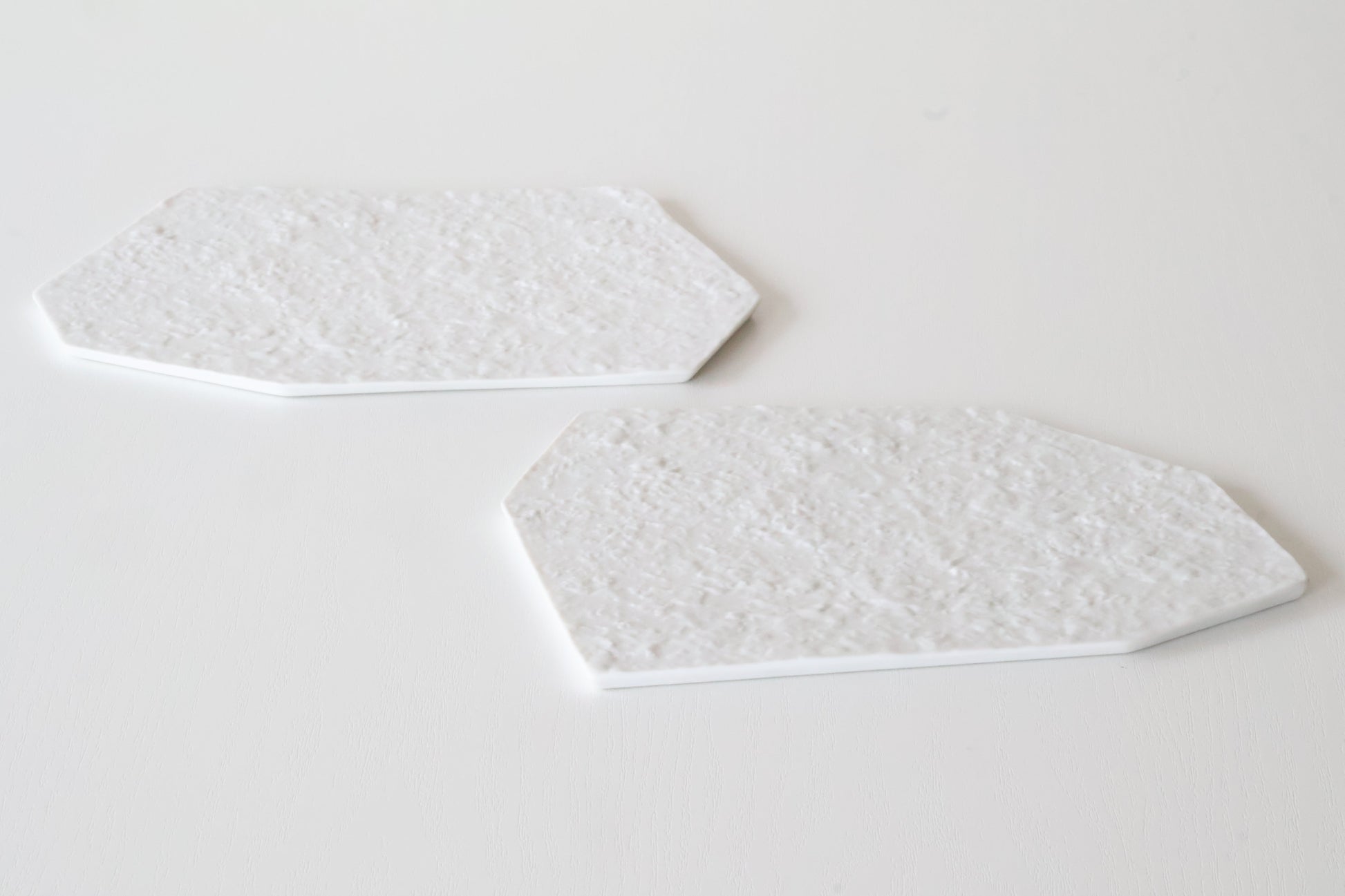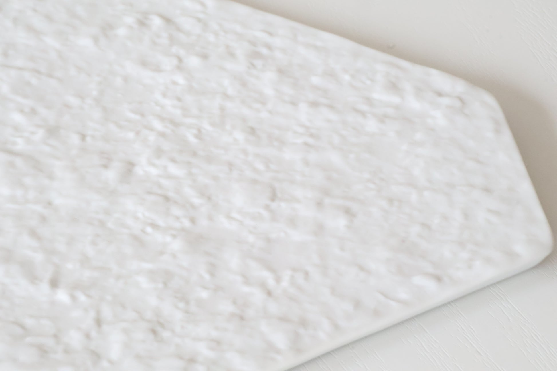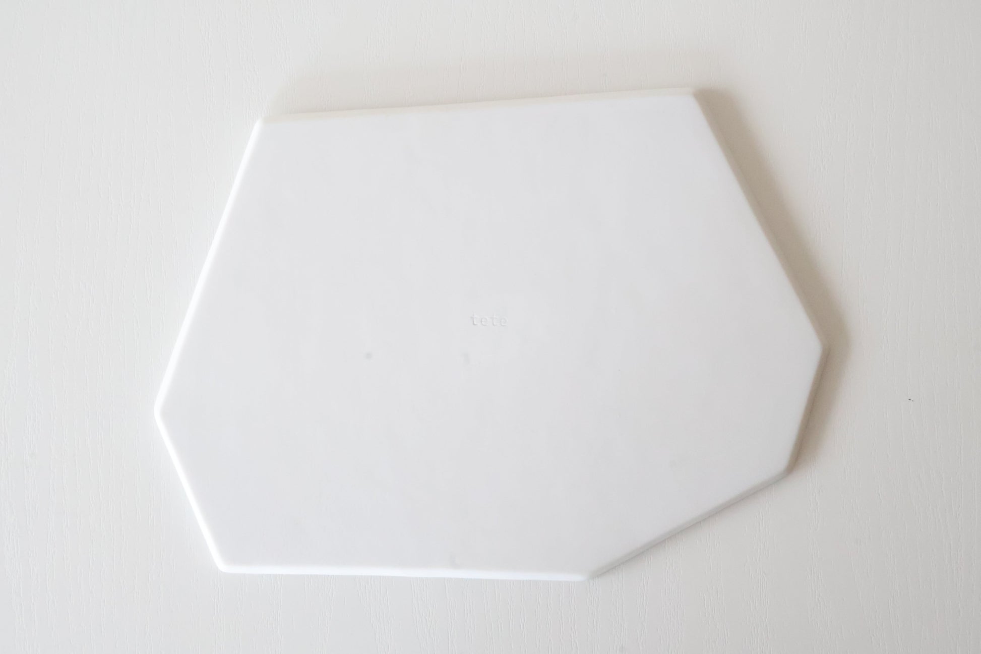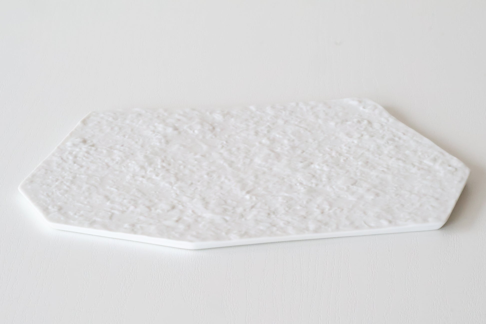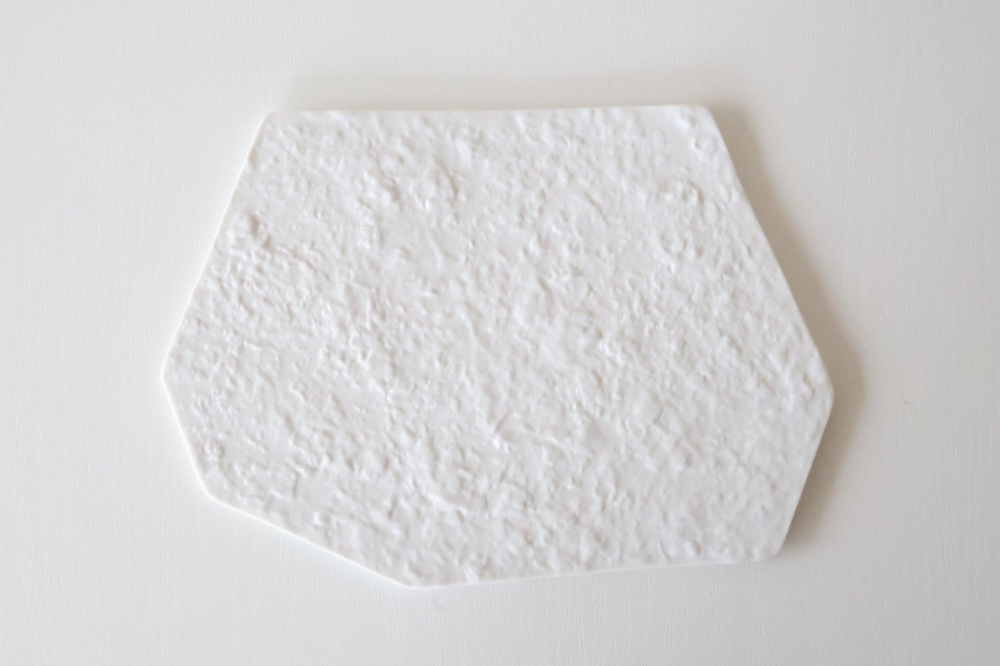 角度や光によって表情を変える、石肌のような質感が魅力。縁の立ち上がりがほとんどないフラットな形状で、前菜やデザート、ワンプレートディッシュにもおすすめです。シンプルながら印象的な多角形のデザインは、食卓に静かな存在感をもたらします。和洋どちらのお料理にもなじみ、盛りつけの自由度が高いのも特徴です。