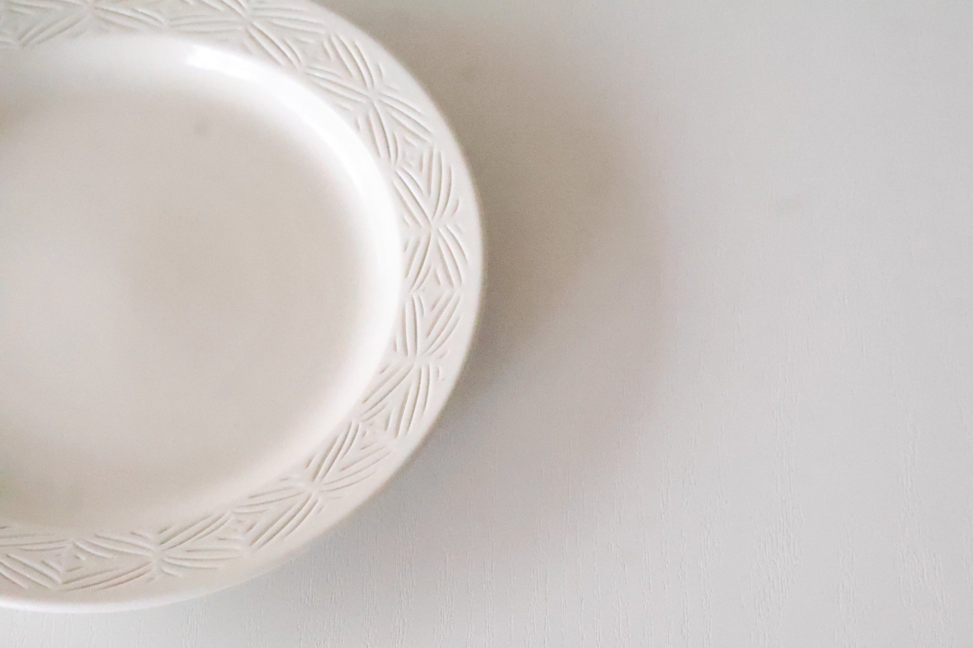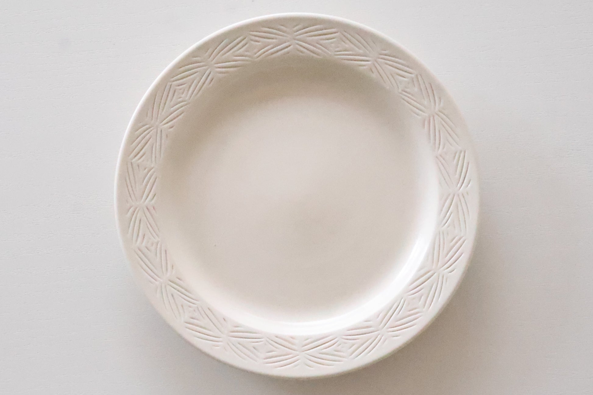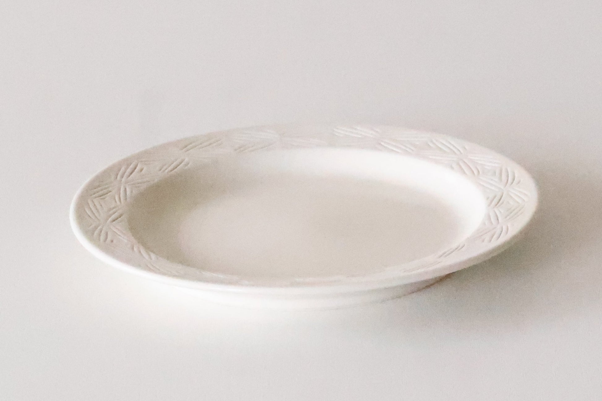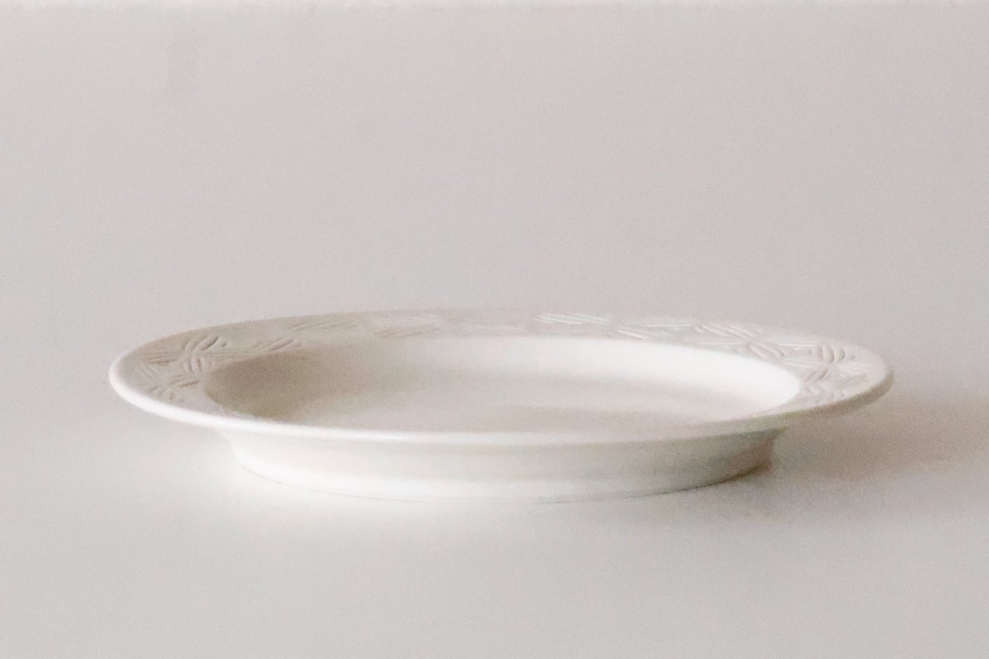 朝食のワンプレートやスイーツの盛り付け、おもてなしの取り皿としても活躍する使い勝手の良いサイズです。リム部分の彫模様が光を受けてさりげない陰影を生み、食卓に豊かな表情を添えます。日常の食事を丁寧に楽しむ時間にぴったりのプレートです。